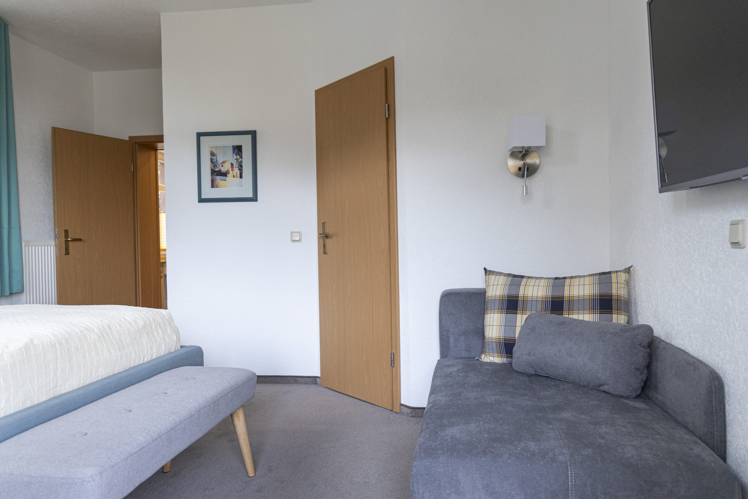 Schlafzimmer mit großem Doppelbett und Schlafsofa, separate Sitzgelegenheit